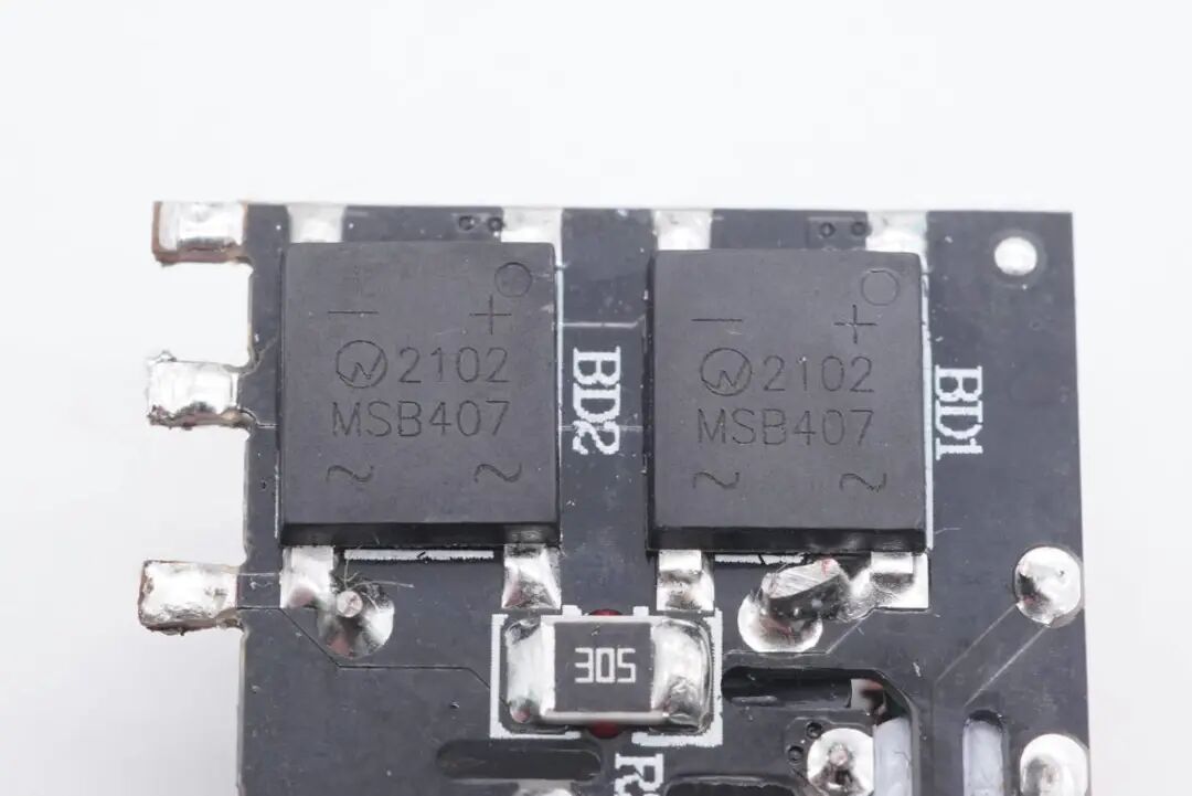 输入端小板上的整流用于将高压交流电转换为脉冲直流电,这里使用两颗桥并联,均摊发热。