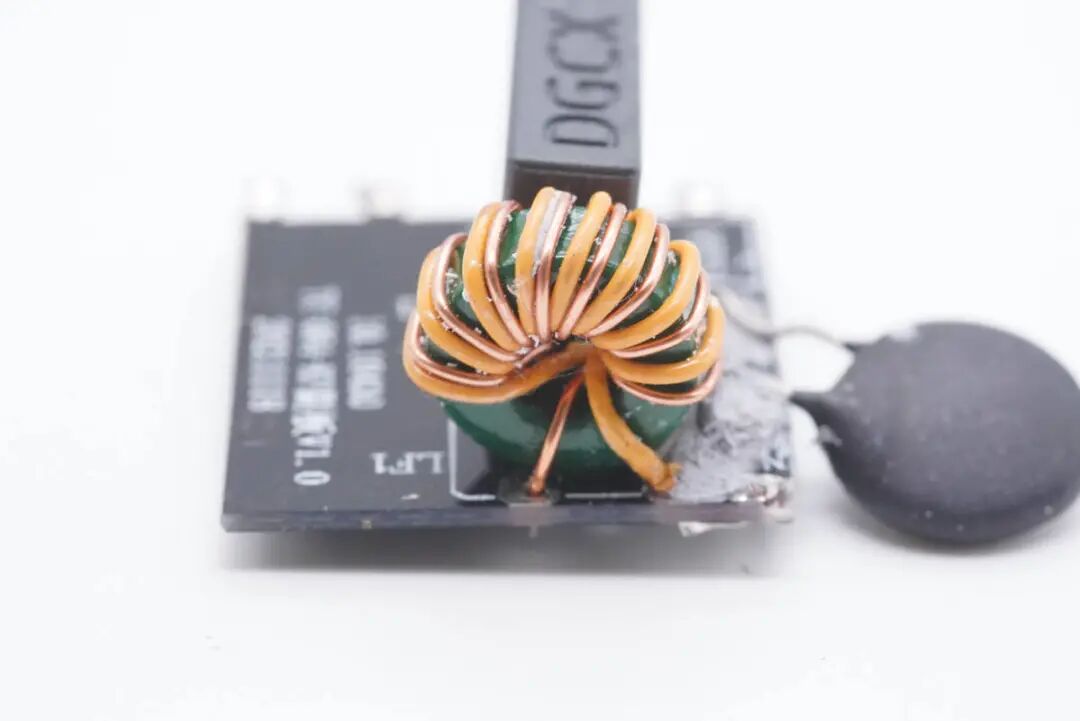 正面设有安规X电容、NTC热敏电阻以及共模电感。