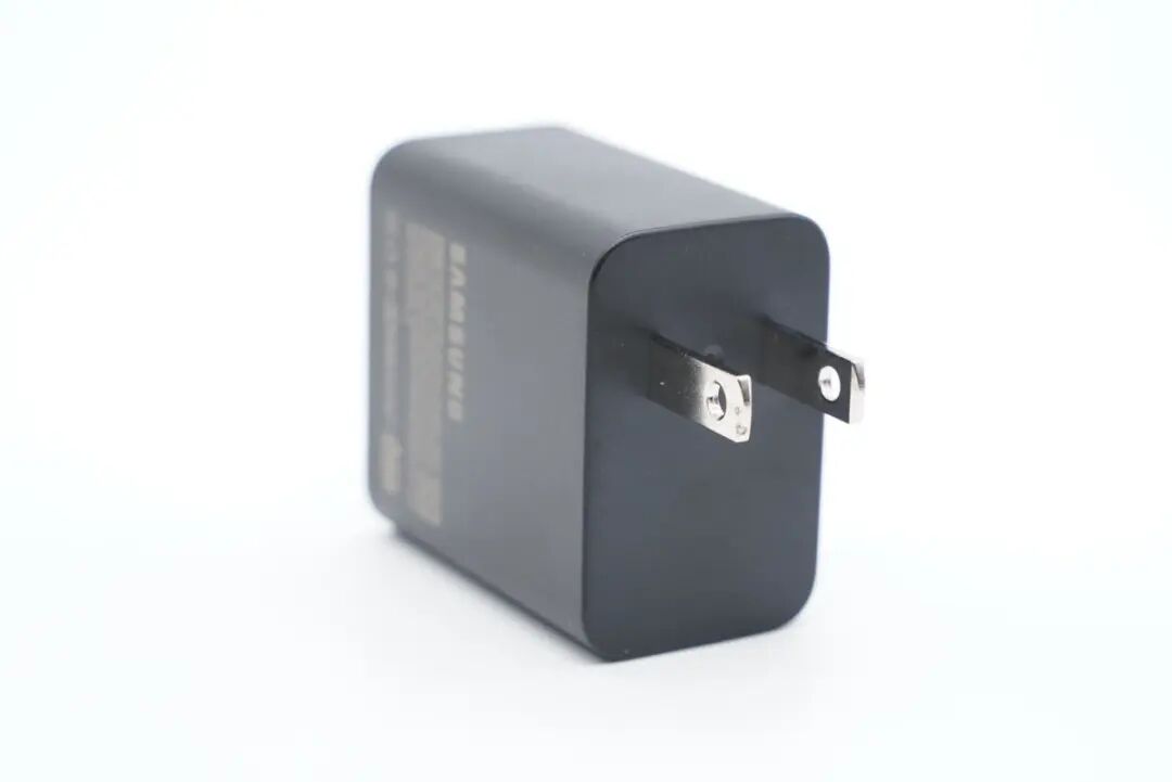 三星美版45W氮化镓快充和国行版的除插脚外,并没有其它的不同,机身通体黑色,表面磨砂处理。