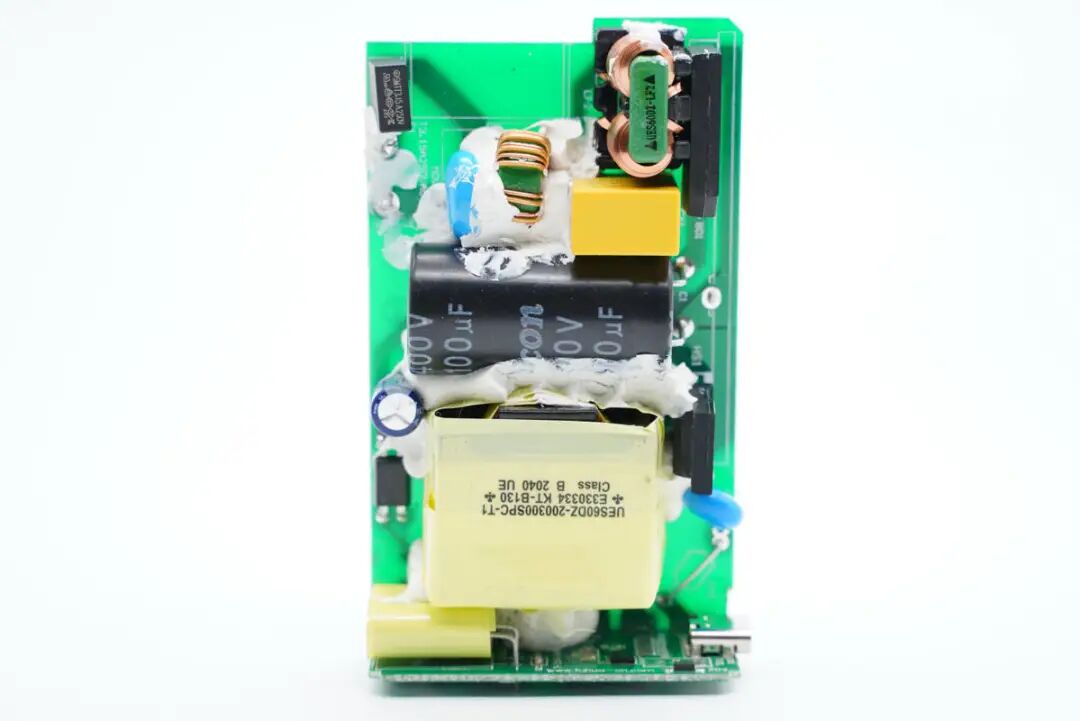 两颗输出滤波电容采用横向布置,并且外部包裹了胶带绝缘,接口侧设有一颗VBUS开关管。