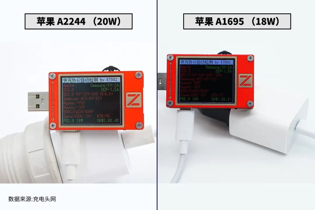 苹果A2244和A1695两款充电器兼容协议完全相同,使用ChargerLAB POWER-Z KT002测得充电器都只支持PD2.0快充协议。