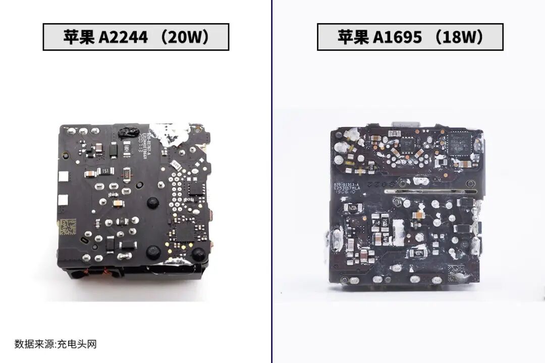 实测苹果A2244的三维为40.91*41.73*26.67mm,功率密度为0.44W/cm³;另外测得苹果A1695的三维为41.45*42.5*27.31mm,功率密度约为0.37W/cm³。