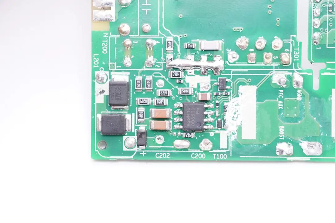 拆掉滤波电感、滤波电容后,可以看到该器件对应下方区域设有PFC升压控制器。