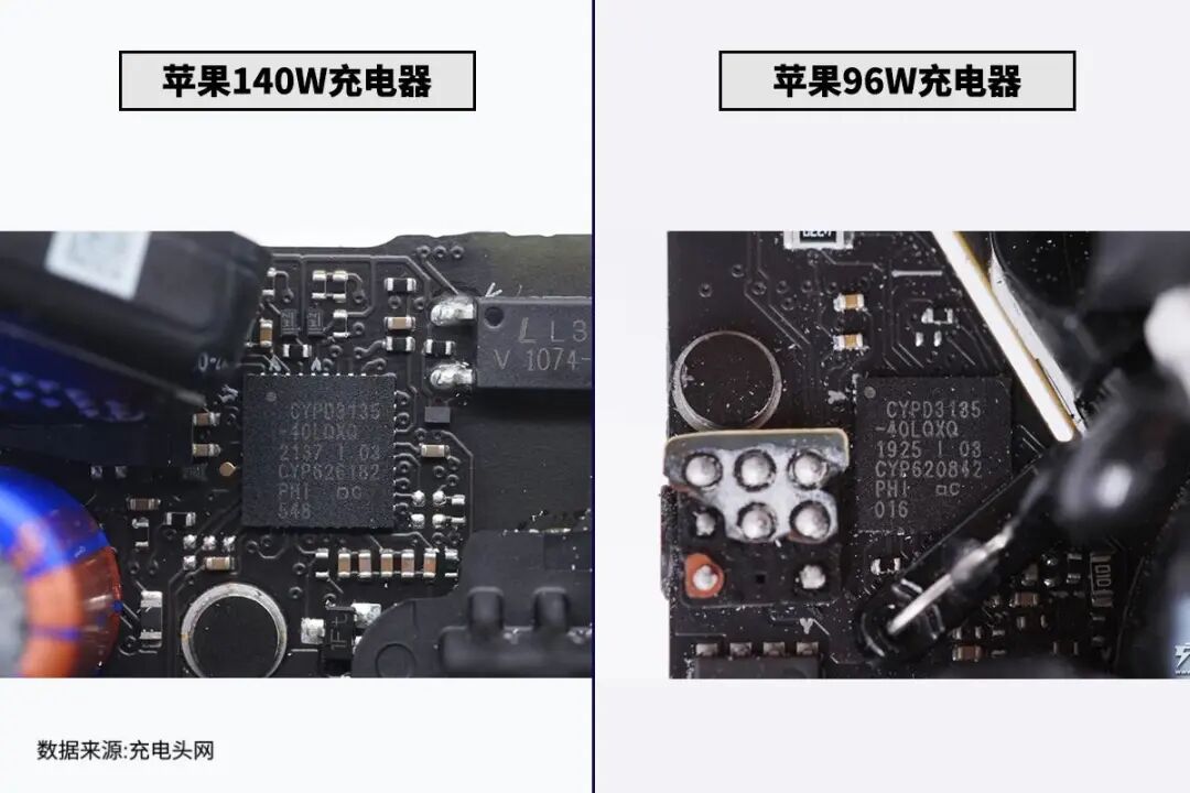 两款充电器的协议芯片均为英飞凌CYPD3135,属于CCG3系列。负责USB PD的通讯,这是一颗专为苹果定制的型号,也是业界首款支持USB PD3.1快充的协议芯片,内部还烧录了苹果充电器SN编码。