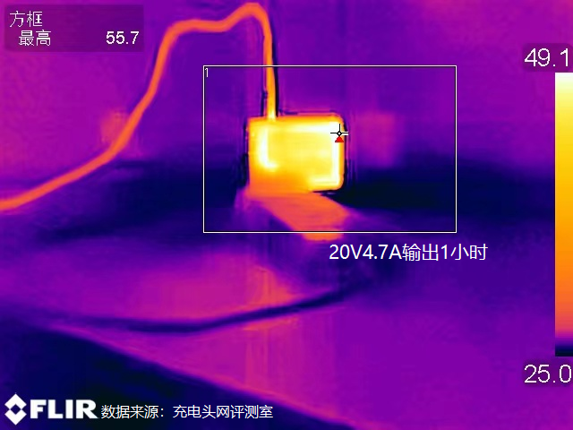 1小时后使用热成像仪拍摄充电器两侧表面的最高温度为59.6℃。