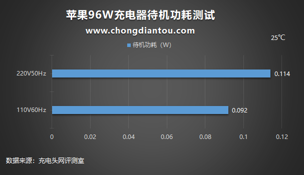 测得苹果96W充电器在220V 50Hz的空载功耗为0.114W,在110V 60Hz时的空载功耗为0.092W。