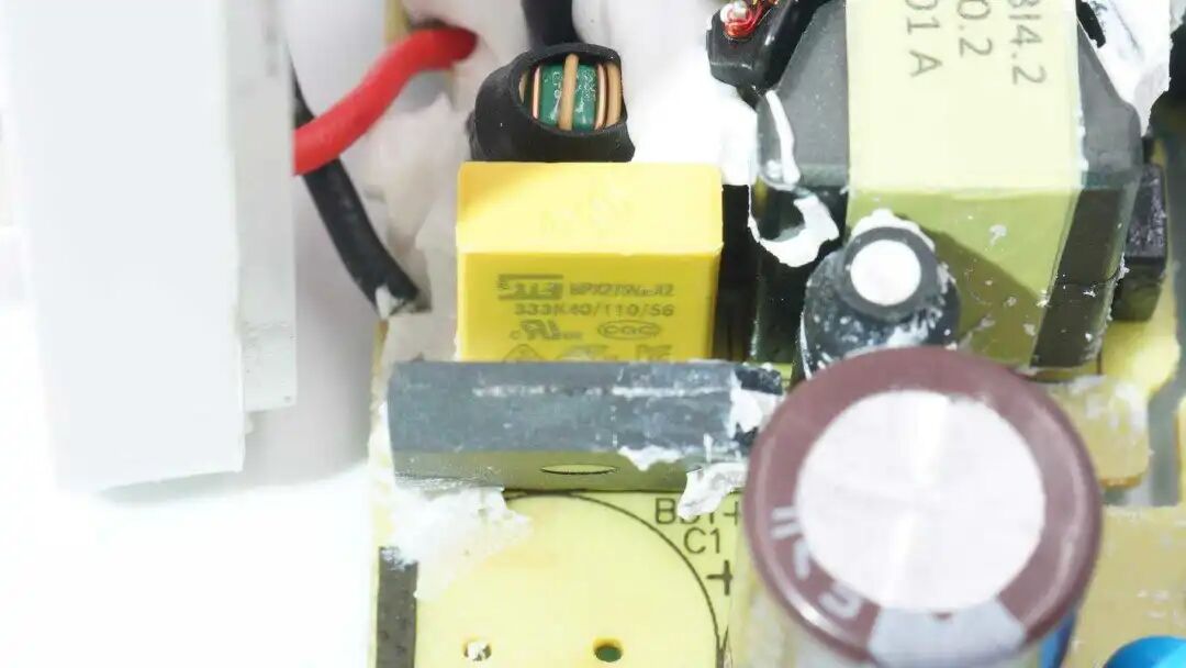 输入端延时保险丝来自东莞市贝特电子科技股份有限公司,出料号 932 2A 250V,具有慢熔断特性,能够承受充电器插电时电解电容的充电电流而不会熔断,规格2A 250V。保险丝下面绿色NTC热敏电阻外套热缩管,用于抑制充电器插电时的浪涌电流,减小插电时的火花。