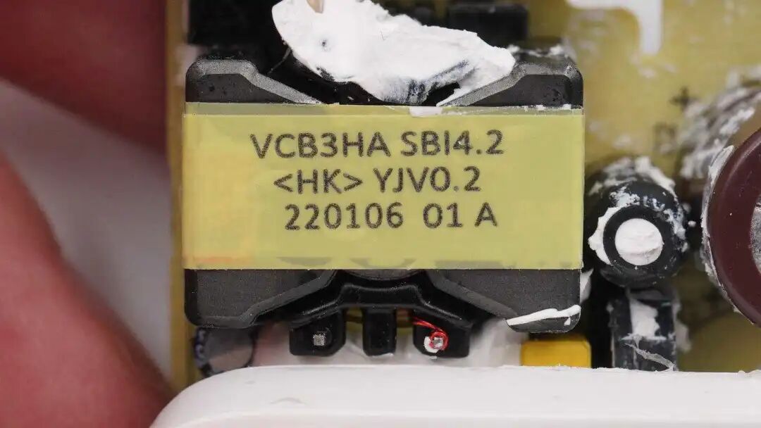 变压器磁芯顶部贴有信息标签,VCB3HA,与充电器外壳型号相同。
