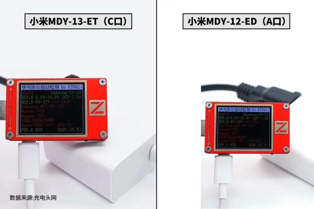使用ChargerLAB POWER-Z KT002测得小米MDY-13-ET和小米MDY-12-ED两款充电器兼容协议相同,都支持QC2.0/3.0、PD3.0快充协议。