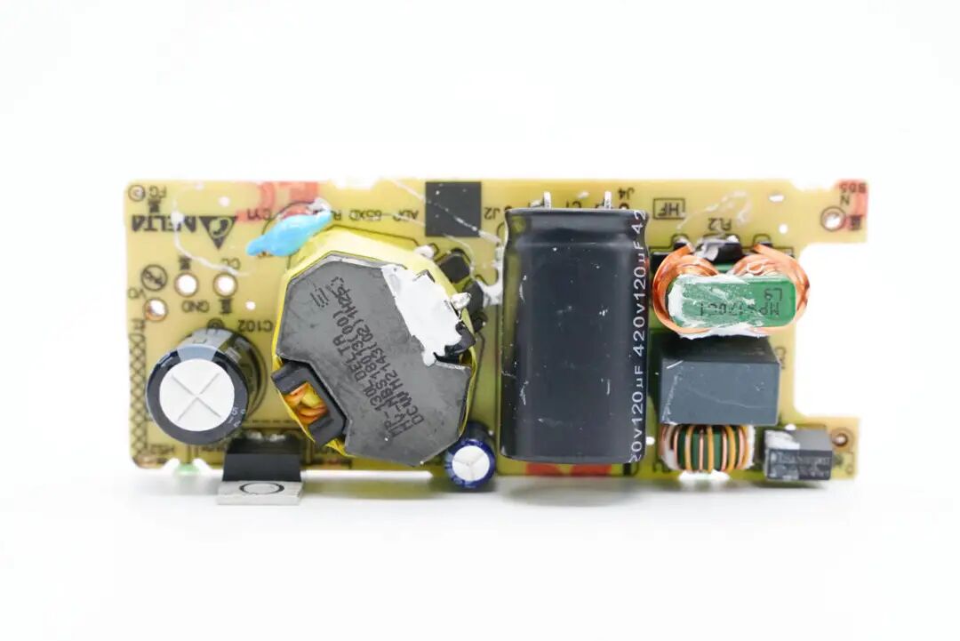 将电路板正反面胶水清理干净,PCB正面一览,左侧是输出滤波电容和整流管,开关变压器,右侧是输入保险丝和EMI滤波电路。初级滤波电容体积很大。