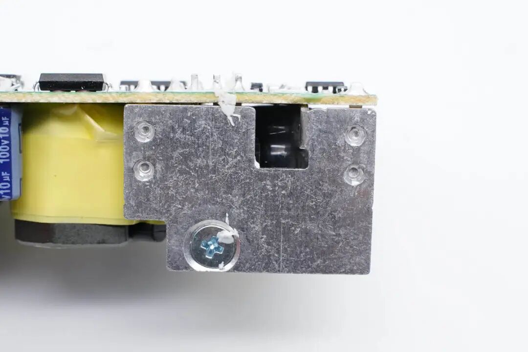 拆下电源PCB上面覆盖的散热片,变压器打胶通过散热片散热,散热片对应初级电解电容处贴有绝缘胶带。