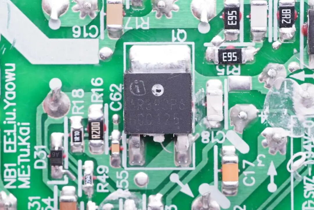 初级开关管来自英飞凌,丝印6R380P6,实际型号为IPD60R380P6,CoolMOS P6系列,耐压650V,导阻380mΩ,采用TO-252封装,正面涂导热胶散热。