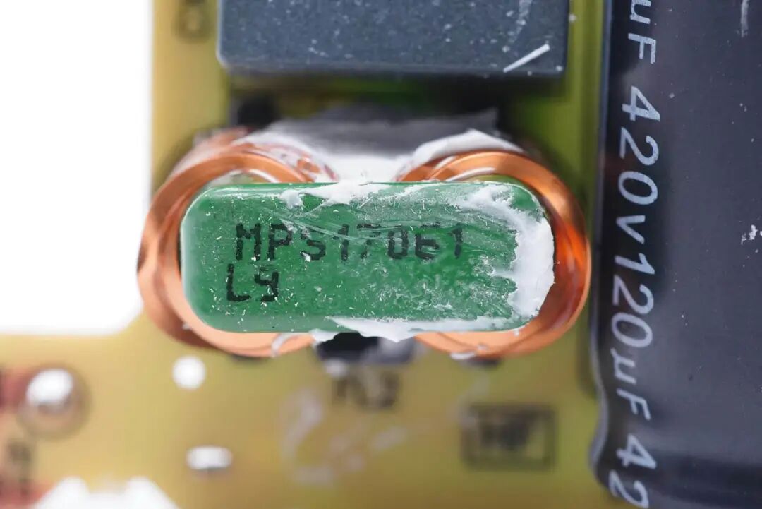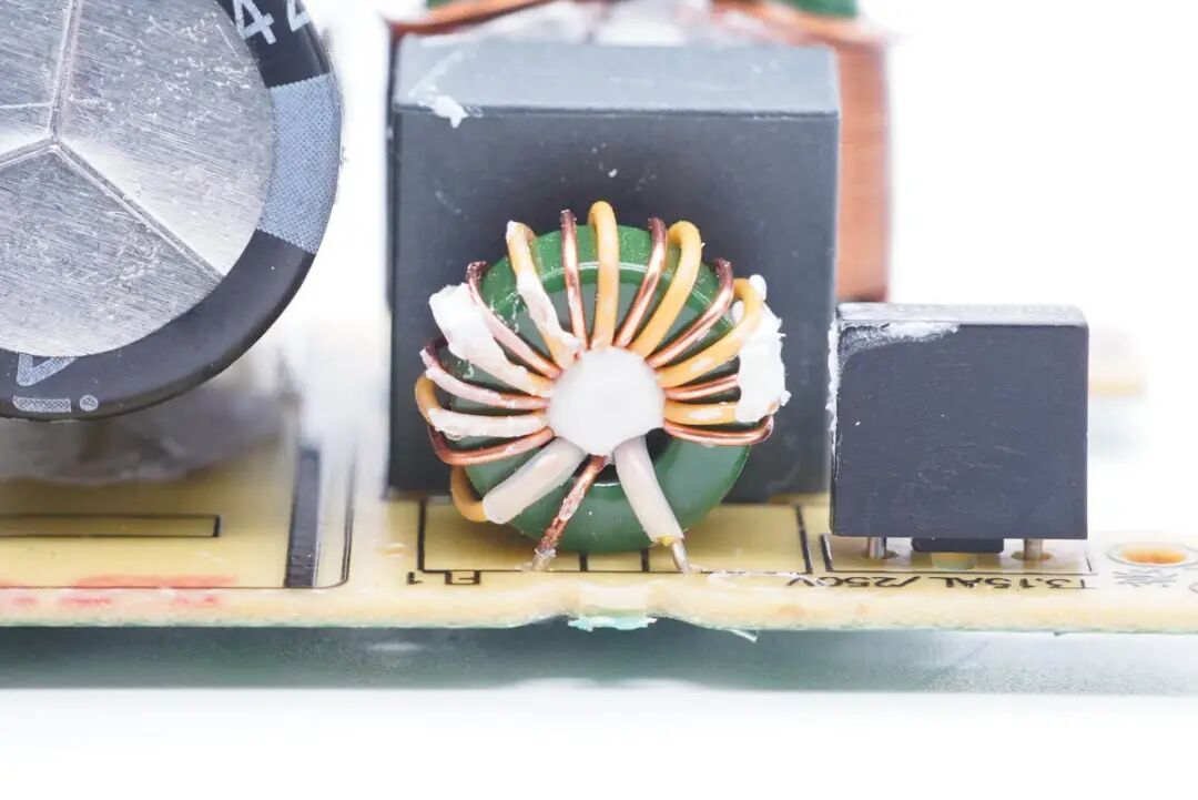 保险丝后面是第一级共模电感,采用漆包线和绝缘线双线并绕在绿色磁环上。
