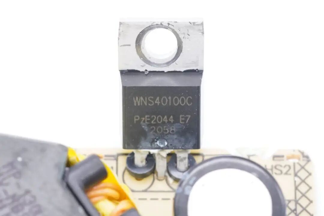 电源使用肖特基二极管整流,整流管来自瑞能,引脚套磁环抑制干扰,型号WNS40100C,40A 100V耐压,采用TO220封装。由于电源体积较大,散热充裕,为了控制成本,使用肖特基二极管代替同步整流。