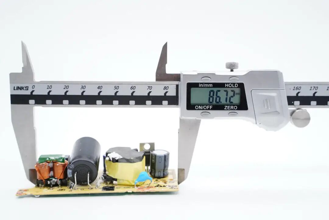 使用游标卡尺测量PCB长度为86.7mm。