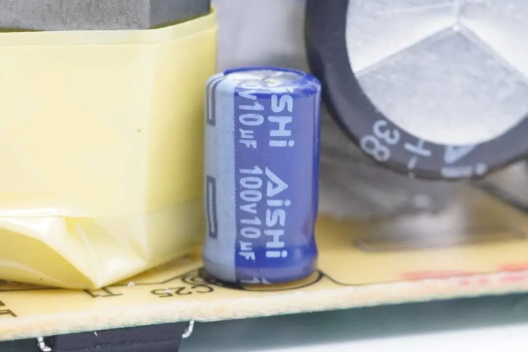为变压器初级主控供电的滤波电容,来自AiSHi艾华。规格为100V10μF。