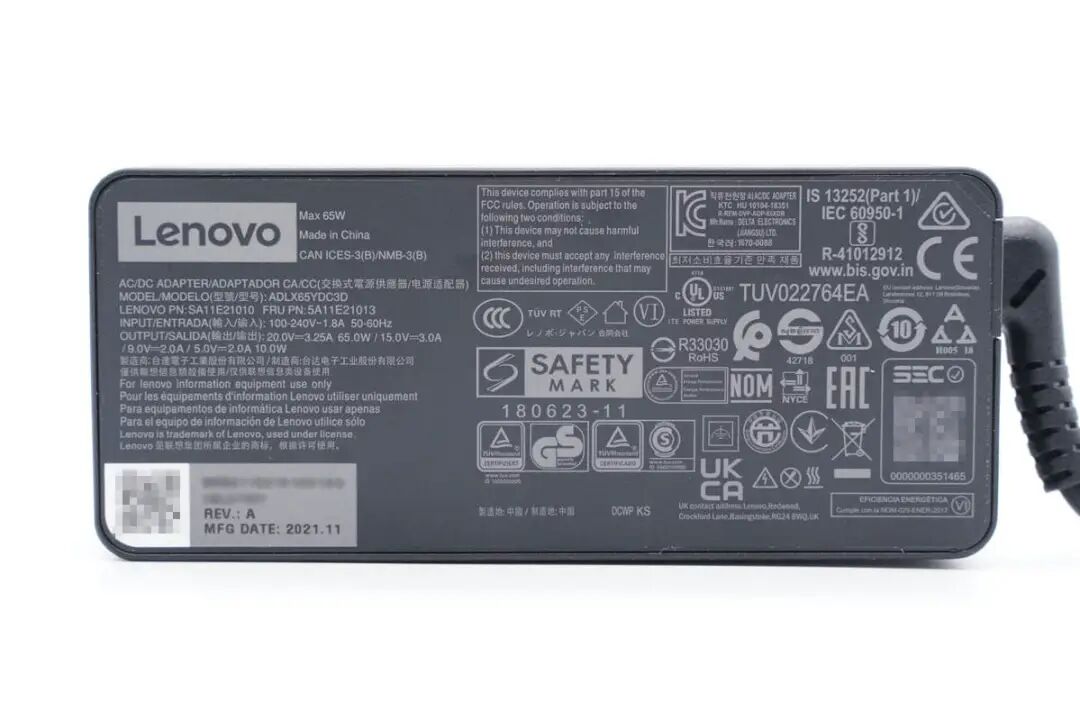 充电头网拿到了一款联想笔记本配机的65W USB-C电源,电源采用联想经典的电源设计,供电线与电源分离,电源自带输出线缆,和以往的配机电源相同,非常熟悉。下面充电头网就对这款电源进行拆解,看看USB-C输出线的电源是怎么设计的。