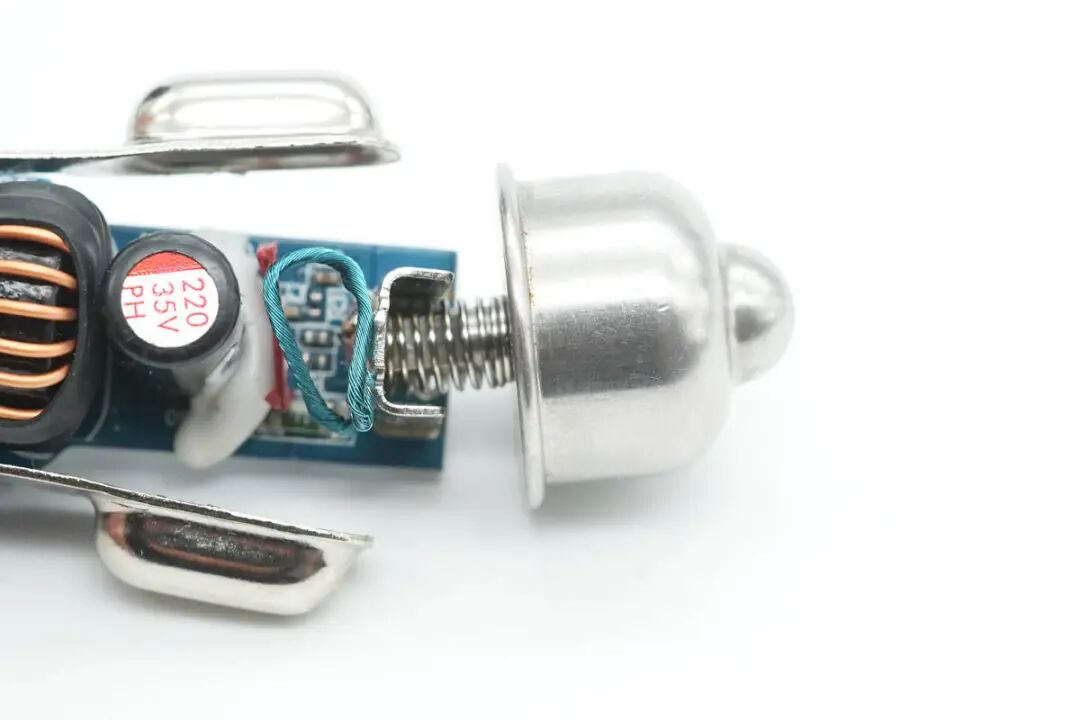 车充正极使用一个较大的端帽,后面弹簧支撑,用于取电。正极与端帽之间焊接一条蓝色漆包线,降低电阻减小发热。