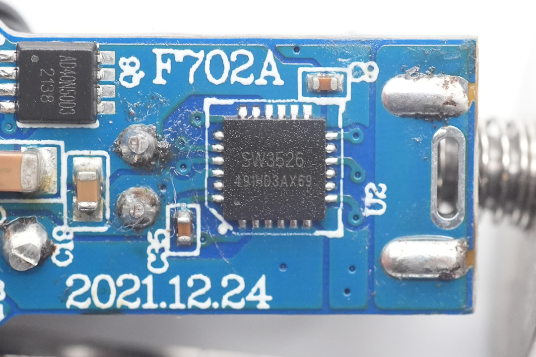在电路板背面是USB-A接口的降压芯片,来自智融,型号为SW3526,是一颗内置协议功能的同步降压转换器。芯片内部集成3.5A高效率同步整流降压转换器,支持PPS、PD、QC、AFC、FCP、SCP、PE、SFCP、低压直充等充电协议,支持CC/CV模式,外部仅需少量器件,即可组成完整的高性能多快充协议充电解决方案。