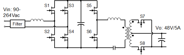 随着USB PD3.1协议的推出,将充电器的输出功率自20V5A到对应的28V、36V和48V,电流不变仍为5A,输出功率同步提升到240W,从而大幅扩展了充电器的使用范围,满足更大功率快充的需要。此次英诺赛科针对市场需求推出了一款高效、高功率密度240W氮化镓应用方案。这款参考设计采用BTPPFC+LLC架构,方案中PFC采用无桥图腾柱PFC拓扑,该拓扑消除了传统PFC电路输入端存在的二极管整流桥,从而大幅提高了效率和功率密度。PFC开关管采用GaN,可以实现更高的开关频率,进一步提供功率密度。LLC采用高频方案,最高频率400kHz,搭配控制器较小的死区时间,可缩小磁件体积、减小线包直流损耗,有效提升效率和功率密度。- 拓扑 CRM Totem Pole PFC + LLC