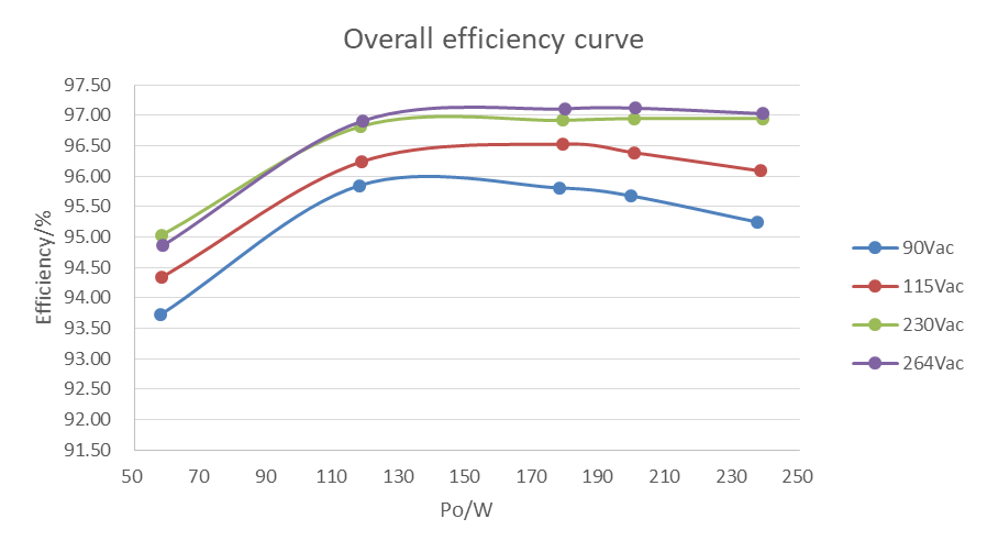 得益于新拓扑以及高性能的氮化镓应用,在90Vac~264Vac全电压范围,输出满载工况下,最高效率达到97%,平均效率最高达96.5%。BTPPFC慢桥臂采样Rdson更小的功率管,效率可进一步提升。据英诺赛科对整机的温升测试,在环温25℃、无主动散热措施、输入90Vac、输出48V/5A工况下老化,PFC GaN管温度114℃,LLC GaN管温度84.7℃。同步整流管的温度分别为83.4℃。在氮化镓的加持下,整机效率高,器件温升低,系统温升易处理。![]()