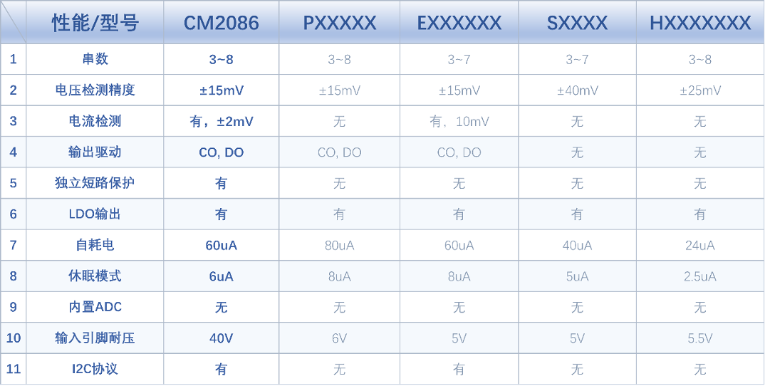 与行业内其他竞品相较,创芯微最新推出的AFE模拟前端芯片性能优异。CM20X6 系列可以将每一节电池的电压状态和电池组的电流状态传输给外部协同的 MCU,MCU 读取电池组电压状态和电流状态后判断电池组是否进入过充电、过放电、过电流、短路等各需要保护的异常状态,并控制 CM20X6 通过 CO、DO 等控制引脚去开关充放电 MOS,从而实现各项保护动作。