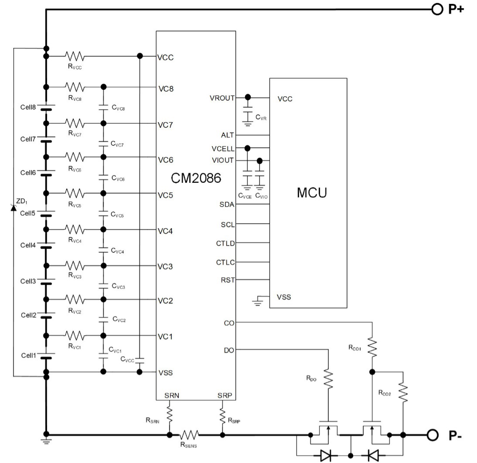从功能来看,创芯微 CM20X6 系列芯片可以协同外部 MCU 对锂电池组进行过充电保护、过放电保护、过电流保护,短路保护等一系列动作,该系列芯片可支持8节串联锂电池组的各类应用。