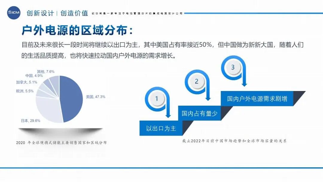 目前及未来很长一段时间,我国的户外电源市场将以出口为主,主要面向欧美地区,其中美国市场占有率接近50%。但随着国内人们的生活品质提高,国内户外电源的需求增长也将被快速拉动。