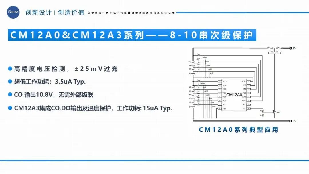 创芯微推出的 CM12A0&CM12A3 系列 8~10 串次级保护方案,支持 ±25mV 高精度电压过充检测,典型工作电流仅 3.5uA;CO 输出为 10.8V,无需外部级联。CM12A3 集成 CO,DO 输出及温度保护,典型工作电流仅 15uA。