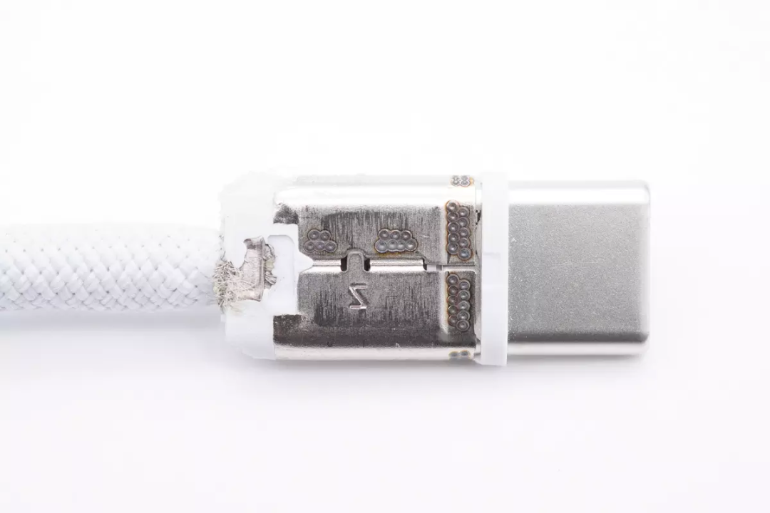 USB-C端子点焊钢套固定保护,尾部填充封胶,USB-C端子组装塑料环填充。