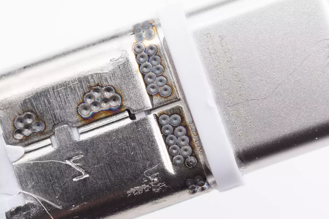 转到另外一面,钢套为两片结构,与USB-C端子通过点焊固定,两片钢套之间也点焊固定,十分牢固。