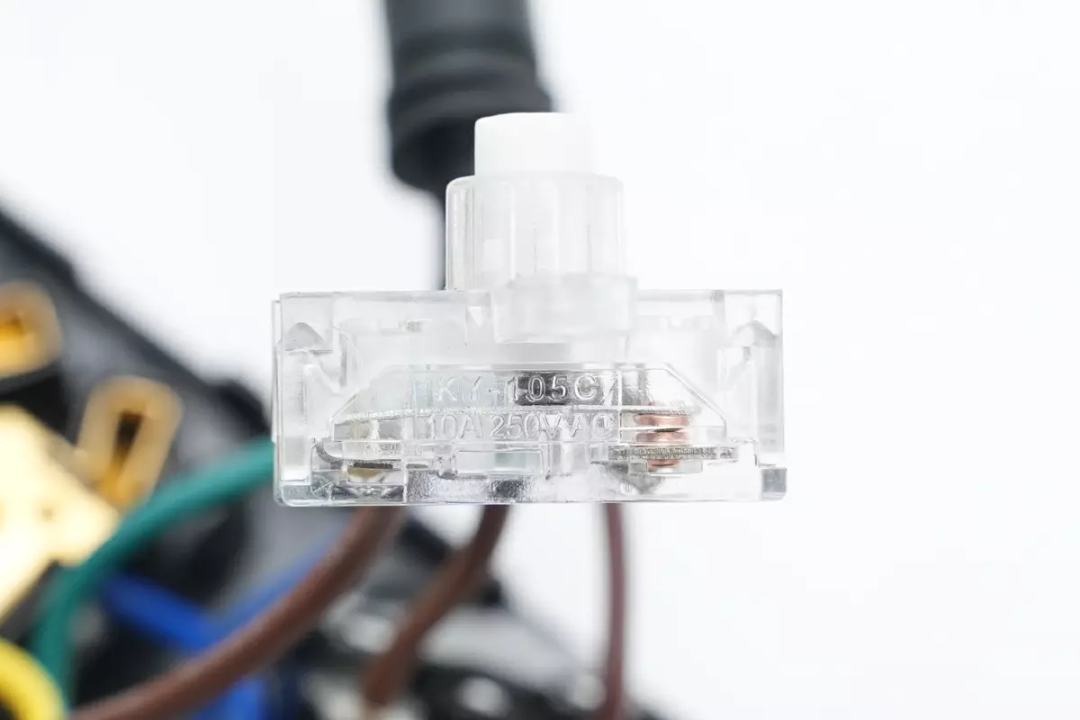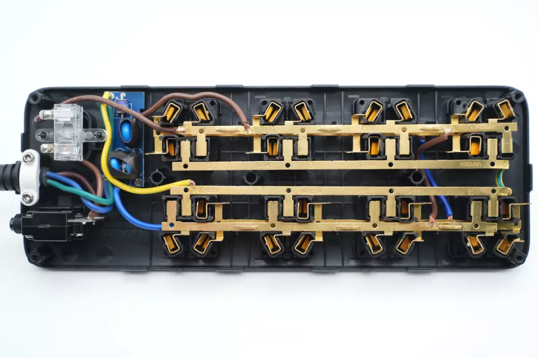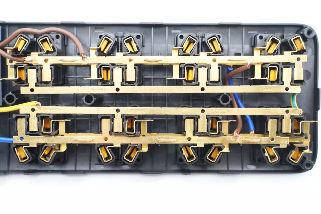 绿联推出了一款八位新国标延长线插座,这款插座内置氧化锌压敏电阻和温度保险丝,能够在浪涌来袭时瞬间吸收高压。同时,绿联还在内置的压敏电阻上增设温度保险丝,在压敏电阻温度过高时切断电源,起到保护功能,并且还内置气体放电管,增强过电压吸收能力。这款插座具备多重保护功能,内置电源指示灯和防雷指示灯,可以时刻了解防雷模块状态,保护电器周全。插座采用总控开关,并配有过载保护器,进行超功率保护,插座还内置安全门,通过3C安全认证,使用更加放心。下面充电头网就带来这款八位总控延长线插座的拆解,一起看看内部的设计和做工。包装盒正面印有UGREEN绿联品牌、产品名称、外观图以及1.8m线长、4kV三线防雷两大卖点。背面印有插座各按键、指示灯释义,并印有产品基本参数和安全警示。另一侧印有符合新国标、耐高温阻燃材料、儿童保护安全门、加粗电源线芯四大特性。包装内含防雷插座、产品说明书和合格证,插座本体外套防尘塑料袋。绿联八位总控延长线插座采用高温阻燃PC材质外壳,拥有月影灰简约设计;共配置八组五孔位设计,皆为新国标规格组合插口,一孔一用,一体式铜条设计比传统插座更耐用耐插拔,官称拥有5000次插拔寿命。电源线插头两侧设有内凹槽,方便插拔,插脚套有塑料壳保护。此外规格为10A 250V~,通过了CCC认证。电源线外皮印有“监制商:深圳市绿联科技股份有限公司”、“CCC认证“、“300/500V 3*1.0mm²”,采用加粗电源线芯,安全系数更高,使用更安全。防雷插座侧面设有超功率保护开关,当电器工作总功率超过额定功率 2500W 时,此开关会自动弹出保护设备,在确认电器总功率未超标情况后,再按下即可正常通电使用。和前不久拆解的绿联八位总控延长线插座CD322相比,这款不仅耐脏,而且顶部面板呈银灰色,金属感十足。顶面设有机械按压式总控开关按键,按键反馈更清脆并且阻力更大,防止儿童误触关闭/开启电源。按键旁还有通电和防雷指示灯,通电后,左侧电源指示灯表明通/断电状态;右侧防雷指示灯常亮,防雷功能正常;灯灭则代表已成功吸收电涌,防雷功能失效。插座除地线接口外,单孔拥有75N(约15斤)安全保护门,不怕儿童误插插孔,用电更安全。插座侧身和底部为一体式黑色外壳,表面磨砂抗指纹。底部设有防滑垫、外壳上印有产品信息。插座型号为CD301,技术参数2500W,10A(Max)250V~,制造商为深圳市绿联科技股份有限公司,产品通过了CCC认证。![]()