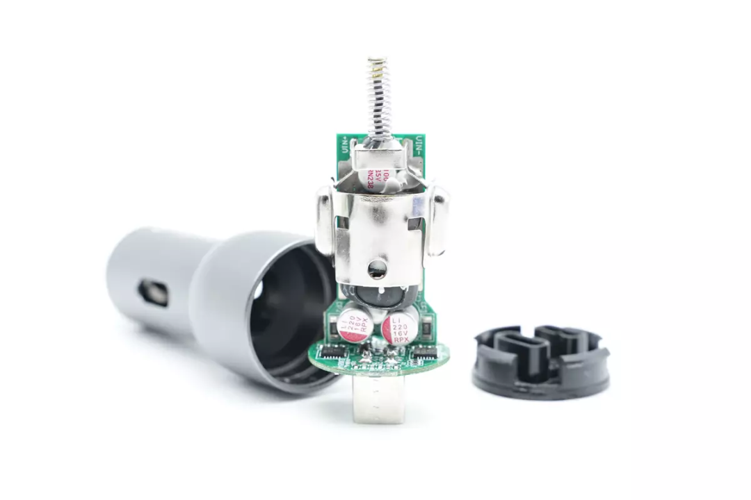 mophie推出了一款40W的双USB-C快充车充,这款车充具备两个独立的20W输出,具备5V3A和9V2.22A输出档位,能够满足两台苹果手机的同时快充。得益于使用USB-C接口,对于安卓手机和平板电脑也有很好的兼容性。这款车充还采用铝合金外壳,在散热性能提升的同时更加耐用。下面充电头网就对这款mophie这款双口车充进行拆解,看看内部设计和用料。包装盒正面印有mophie品牌、车充外观图以及产品名称。mophie 40W 双USB-C口车载充电器整体延续铝制金属外壳设计,插入端左右两侧的双金属弹性触点设计兼容主流点烟口,与输出底端圆弧过渡;正面仅镭刻 mophie 品牌Logo,简约明了。输出(USB-C1/C2):5V3A,9V2.22A车充输出面板配置双US-C接口,接口间设有指示灯,外壳上有mophie品牌。mophie 40W双USB-C口车载充电器长度为68.49mm。通电后,可看到LED灯显示颜色为水蓝色,柔光不刺眼。PDO报文方面,USB-C口具备5V3A、9V2.22A两组固定电压档位,以及3.3-11V2A一组PPS电压档位。测得另一个USB-C口协议和PDO报文完全相同,不再赘述。看完了这款车充的开箱和测试,下面就进行拆解,一起看看内部的用料和做工。PCBA模块正面一览,顶部焊接正极弹簧,输入滤波电容,降压电感和输出滤波电容。底部焊接小板焊接USB-C母座。侧面一览,在负极金属片内部为磁环降压电感,外套热缩管包裹绝缘。在PCBA模块背面焊接贴片保险丝和两颗同步降压芯片,圆形小板通过焊接连接。车充正极弹簧内部固定黑色导线,并使用黄铜铆钉固定,降低电阻,减小发热。输入端正极串联一颗贴片保险丝,用于输入端过流保护。取下覆盖的负极弹片,在弹片下方是输入滤波电容和磁环降压电感。输入滤波电容来自PolyCap柏瑞凯,为RN系列小尺寸固态电容,规格为100μF 35V。降压转换器来自芯谭微,型号NDP1360KC,是一颗同步降压转换器,内置开关管,最高工作电压30V,输出电流为4.8A,工作频率130-300KHz可设置。两颗输出滤波电容规格相同,规格为220μF 16V,分别对应两路输出。USB-C口协议芯片采用英集芯IP2723T,该芯片已通过USB IF协会PD3.0 PPS认证,TID:3135,是一款集成多种协议、用于USB输出端口的快充协议IC。支持多种快充协议,包括USB TypeC DFP、PD2.0/3.0、PPS 、HVDCP QC4、QC4+、QC3.0/2.0、FCP、SCP、AFC、MTK PE+ 2.0/1.1、Apple 2.4A、BC1.2以及三星2.0A。右侧为USB-C母座的TVS保护管,用于静电保护功能。可为适配器、车充等单向输出应用提供完整的TYPE-C解决方案。此外IP2723T具备高集成度与丰富功能,在应用时仅需极少的外围器件,有效减小整体方案的尺寸,降低BOM成本。圆形小板另外一面焊接USB-C母座,电流取样电阻和VBUS开关管,在正中焊接一颗白色LED用于电源指示。mophie这款车充采用铝合金材质外壳,表面喷砂处理,手感光滑。车充配有双USB-C接口,支持5V3A和9V2.22A两档输出电压,以及3.3-11V2A PPS快充,可满足苹果与安卓手机快充需求。两个USB-C口均具备20W输出功率,性能完全一致,支持盲插使用。在双扣同时使用时也能20W输出,非常实用。充电头网通过拆解了解到,mophie这款车充内置两路相同的降压电路,采用芯谭微NDP1360同步降压转换器进行降压,由英集芯IP2723T协议芯片进行输出电压控制。输入滤波固态电容来自柏瑞凯,两颗降压电感均外套热缩管绝缘,并打胶固定。并采用铝合金外壳,整体的用料和做工都很扎实。「电源芯片」