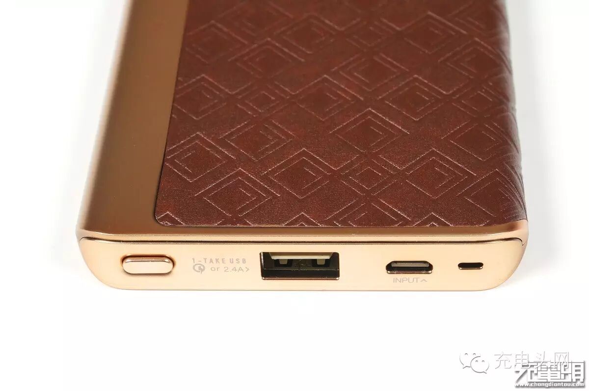 主机由香槟金主打色组成,外包皮质蒙皮增加高级感。MOMAX LOGO 旁边明确标注了高通快充 Qualcomm Quick Charge 2.0 ,表明这是一款支持快充方案的移动电源,而且还是同时支持输入快充与输出快充。按钮与插孔全都安放在顶部,从左到右分别是 电量激活按键、 双面盲插USB输出母座、MicroUSB输入母座、挂绳插孔。