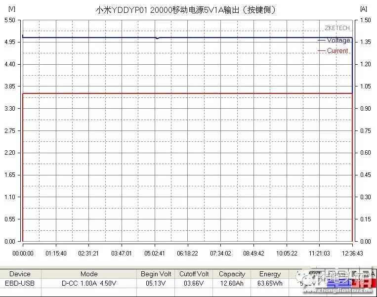 1、按键侧5v1A输出容量测试:输出12600mAh,63.65WH,均压5.05V。输出容量与标称的12700(1A)非常接近。计算转换效率:63.65/68.47=92.96%(接近标称的93%)和63.65/72(TYP)=88.40%。