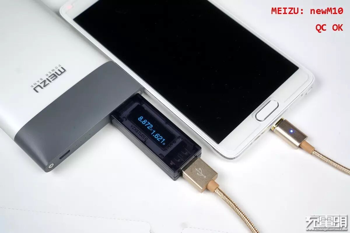 魅族M10 QC移动电源,插入瞬间秒握输出QC,达到满载1.621A。