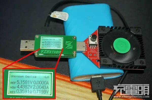 索尼EC801线线阻为0.3591Ω、初始电压5.1581V,损耗后电压4.4382V,2A压降0.7199V。