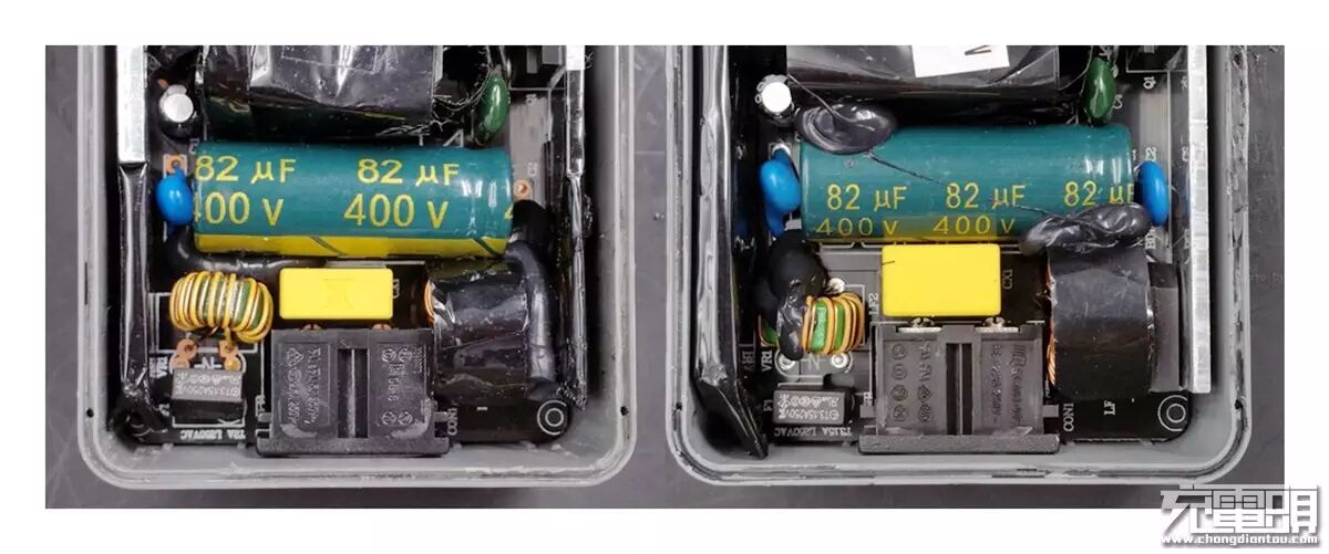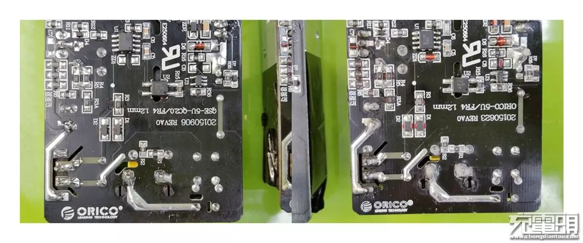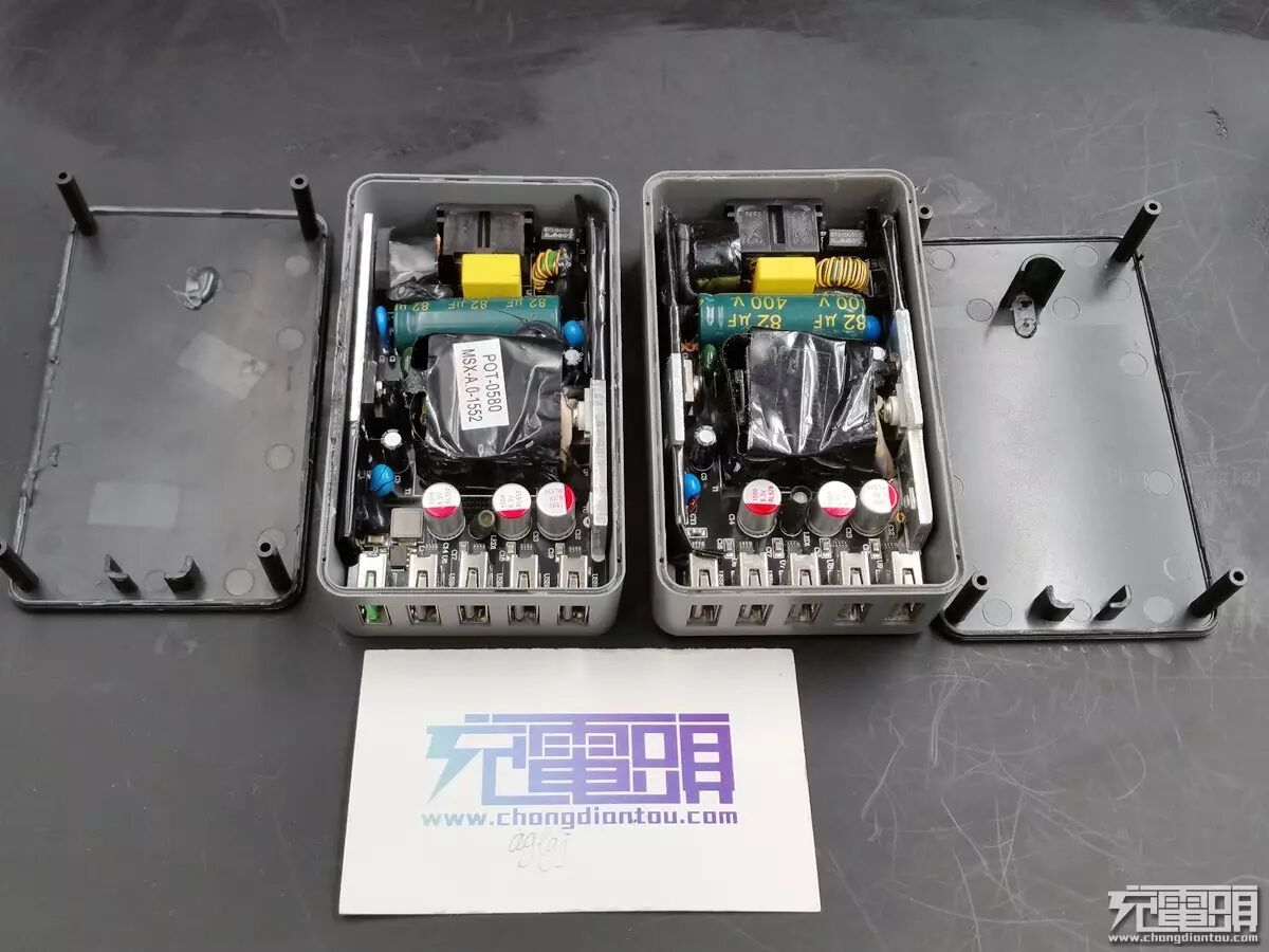 拆解QSE-5U充电器,与旧版本不带QC输出的ORICO-5U版本比较。注:以下图片左边为QSE-5U、右边为ORICO-5U。