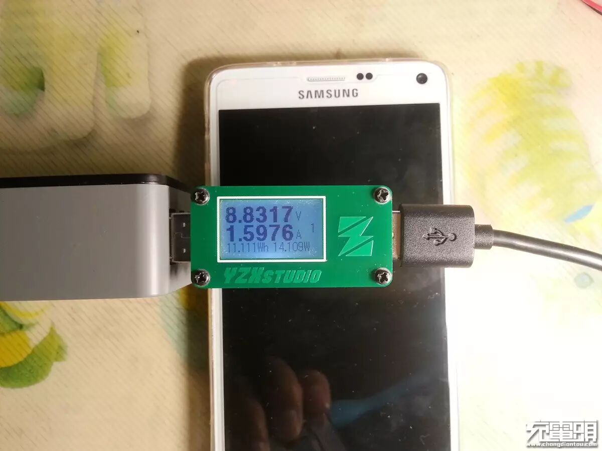 2、普通USB口给三星NOTE2手机充电,正常识别,但由于输出电压无线损补偿,达不到手机正常1.63A的充电电流。