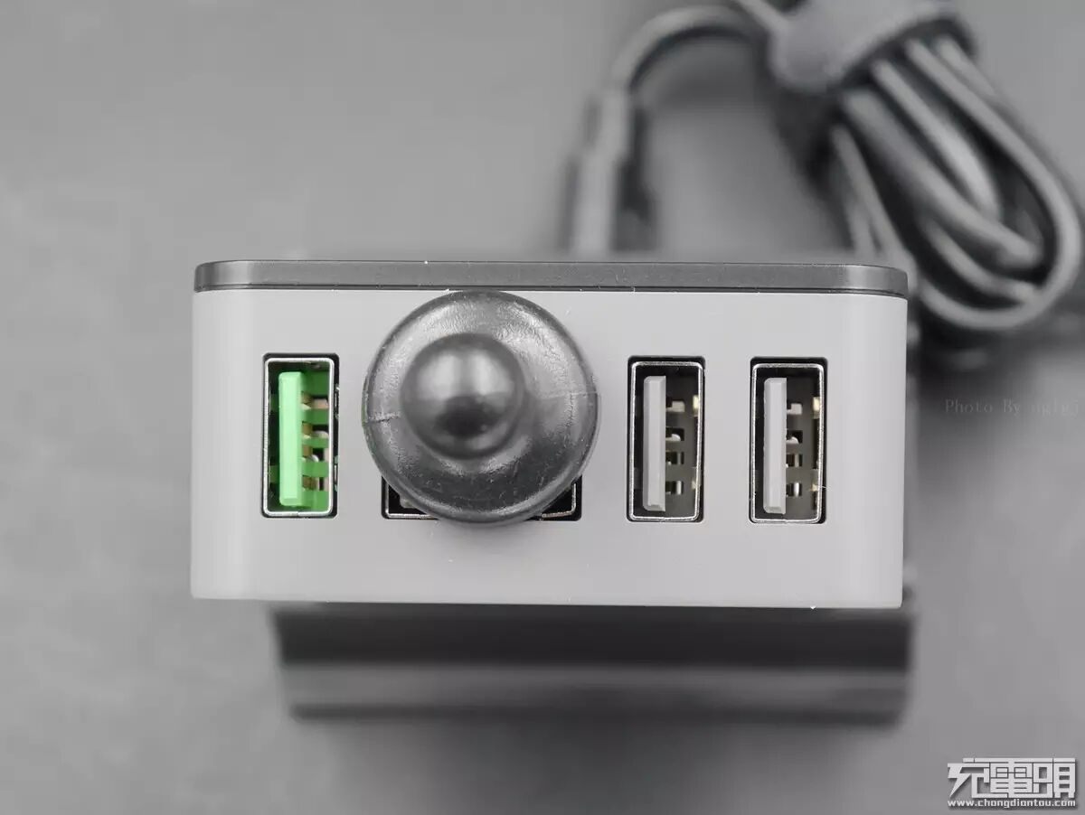 充电器的5个USB输出接口,左边那个是QC2.0接口,舌头是绿色的,右边4个是普通USB接口,舌头是灰色的,USB口的安装并不太整齐,个个别有一小点歪。