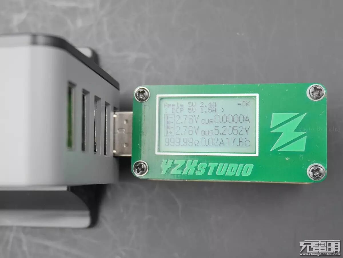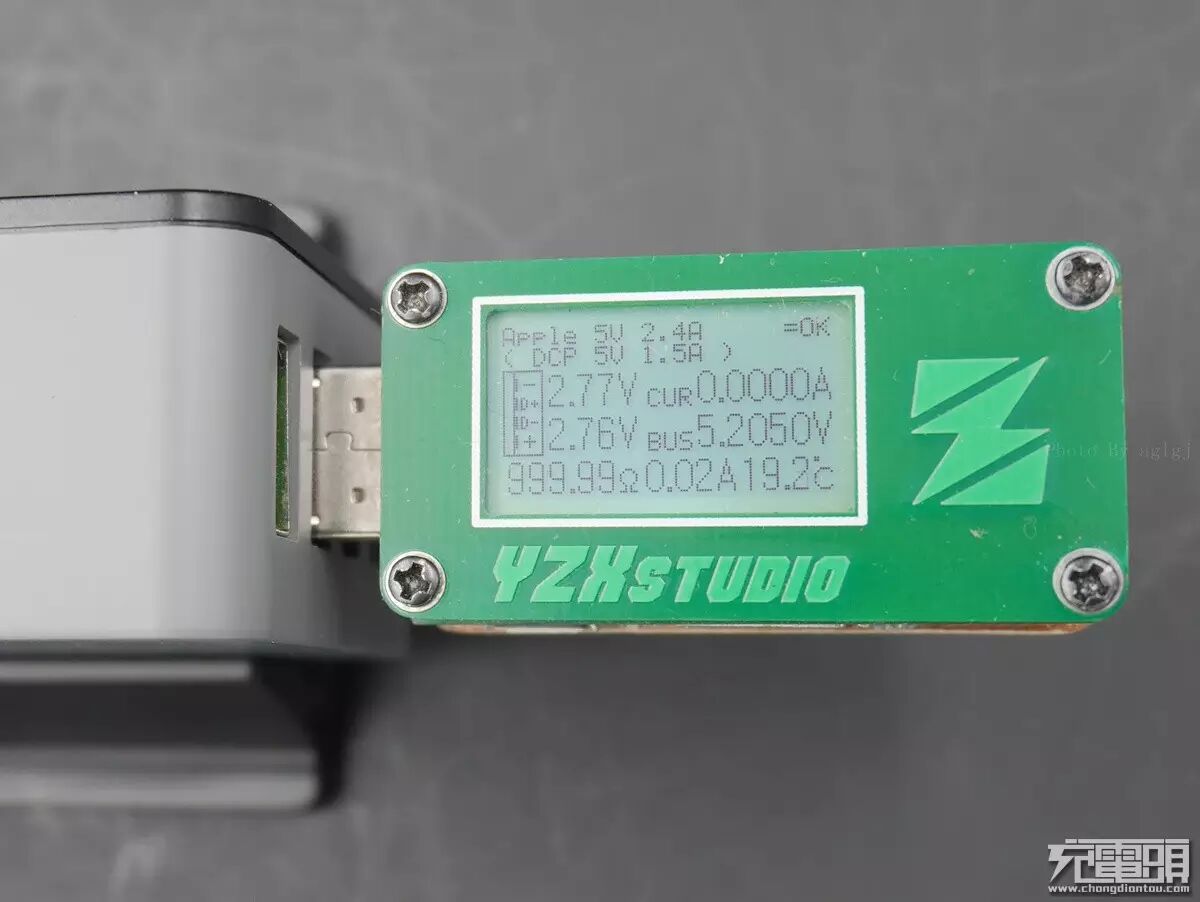 为了测试方便,自行定义离QC输出口最远的USB口为USB1直至QC口为USB5。用YZX绿表测试USB1口空载电压5.2052V,识别Apple 5V2.4A和DCP 5V1.5A。