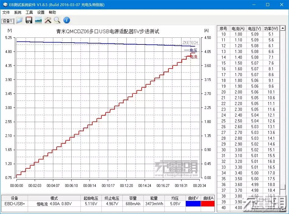 连接EBD USB+进行5V、9V、12V及20V的步进测试,由于EBD USB+本身的局限,未能测试到最大负载,数据仅供参考。
