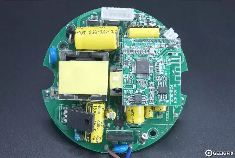 电路板正面排列了所有元器件,集成了主供电、LED驱动、蓝牙模块扬声器功放电路等等,数量较多,但排布十分整洁。可以看到供电电源有两组,一组负责给LED供电,另一组负责给蓝牙模块扬声器功放供电。