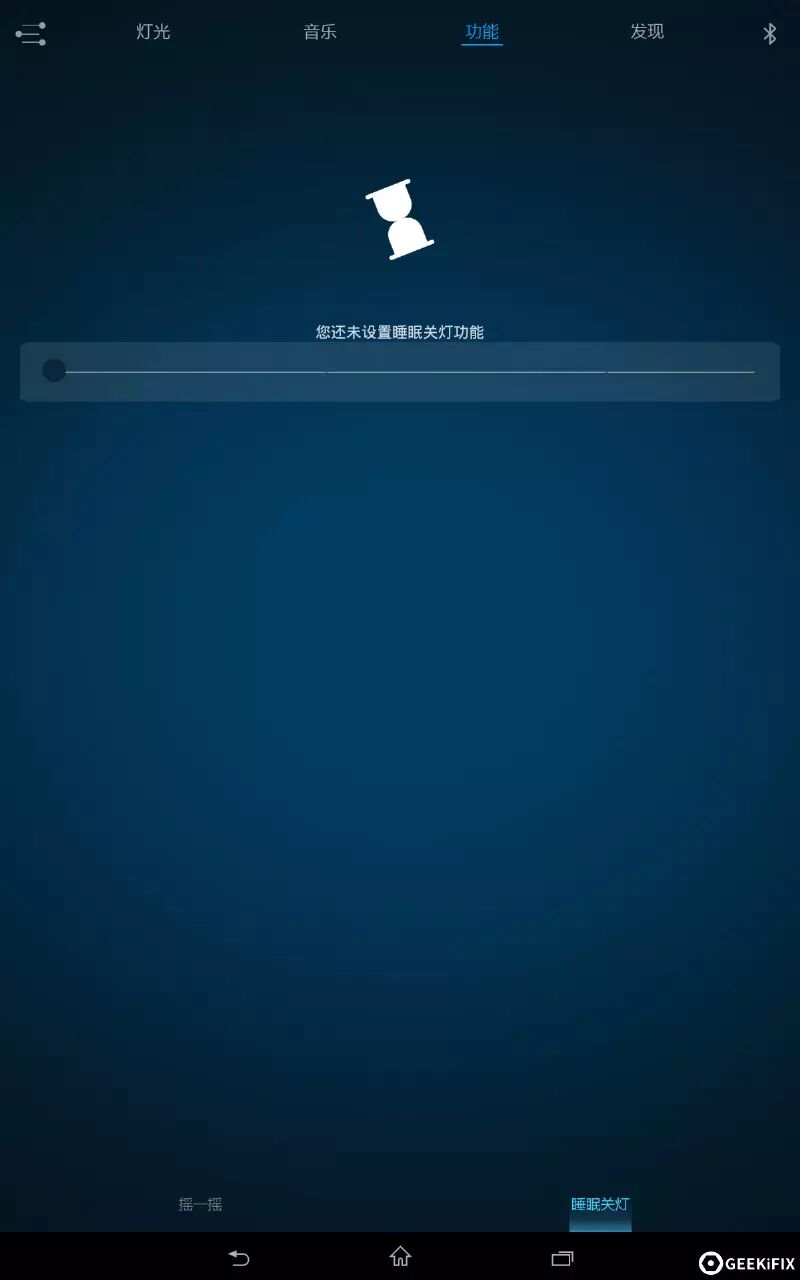 连接蓝牙后进入主界面,整个UI界面带有暗色渐变,看起来还算舒服。第一个界面是灯光调节:在屏幕的上方可以看到调色板,想让灯光呈什么颜色直接点击选择就好,很智能。调色板上半部是亮度调节,下半部是色温调节,可以搭配调出出非常漂亮的颜色。如果你实在懒得调的话,界面下方有预设的六种颜色,直接可以选取使用。