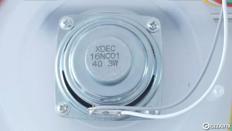 拆掉亚克力罩,发现内部有四组LED灯均布,正因为如此灯光显示效果才非常均匀。中间则是一个扬声器,用来播放歌曲的。