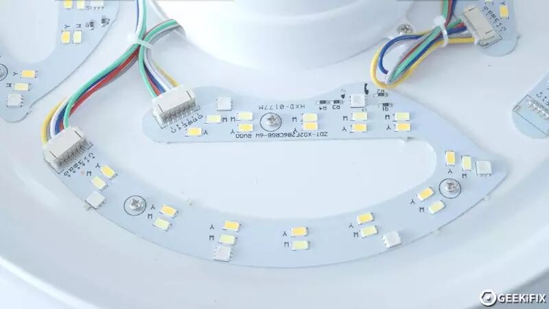 浅色的LED负责正白光输出,深色LED负责暖色光输出,我们在App界面看到的亮度条和冷暖条就是分别用来调节这两种灯的,搭配得当,可以调节出十分赏心悦目的颜色。