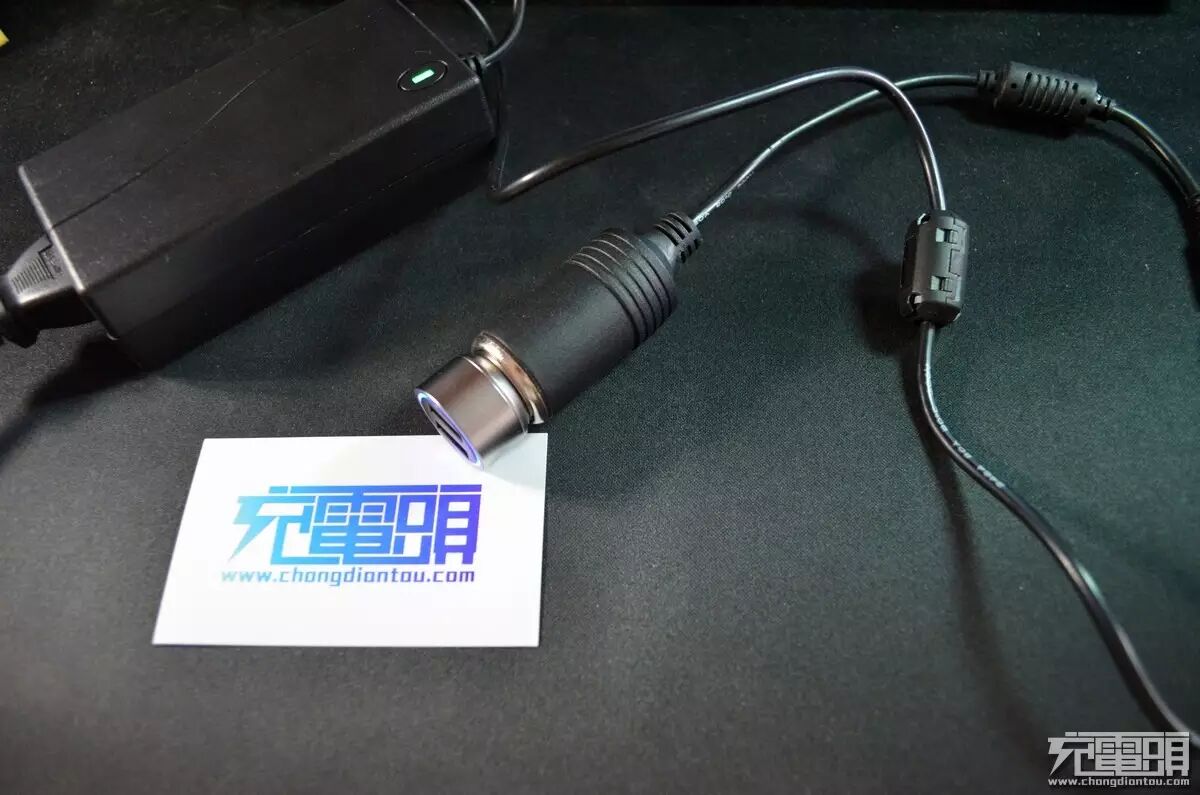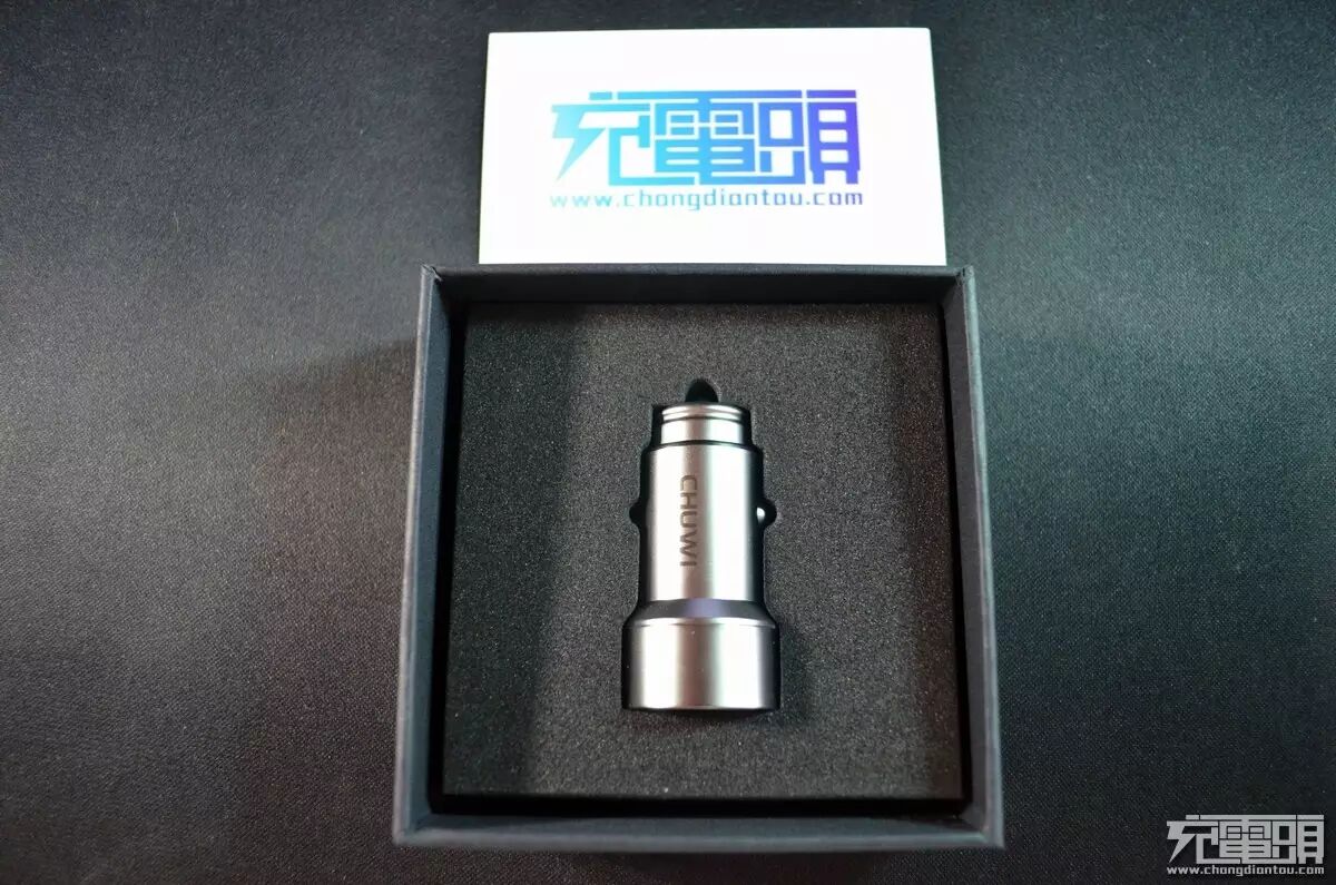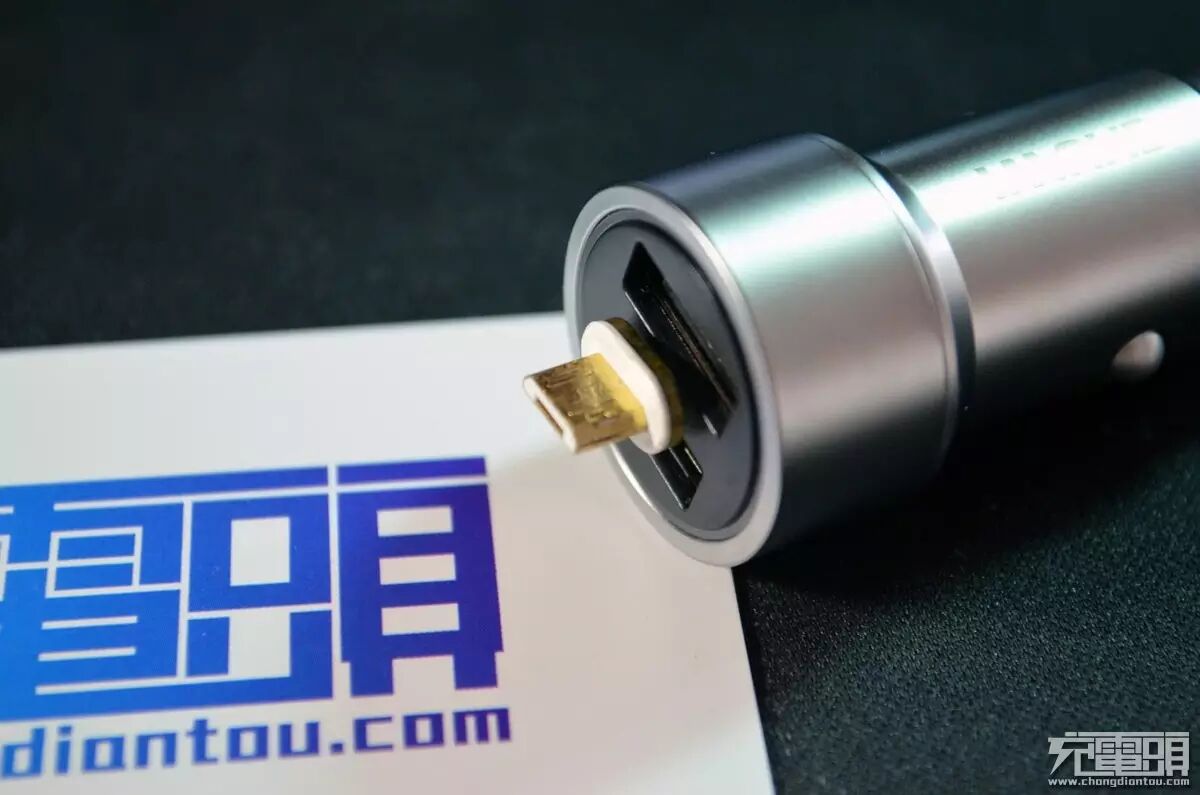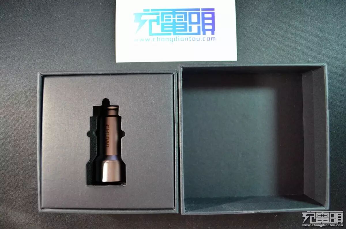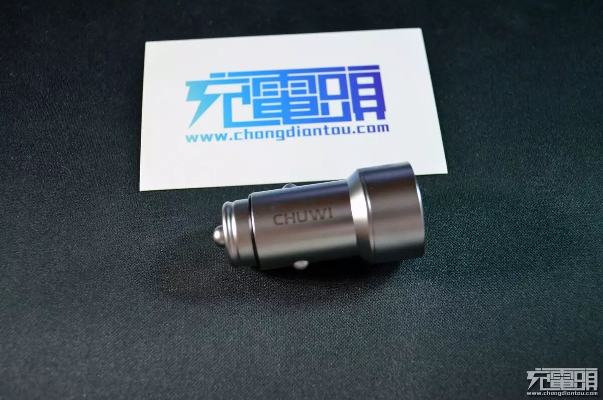 车充采用了全金属的设计,根据厂商宣传是全黄铜镀铬的材质。车充一侧印着驰为的logo。