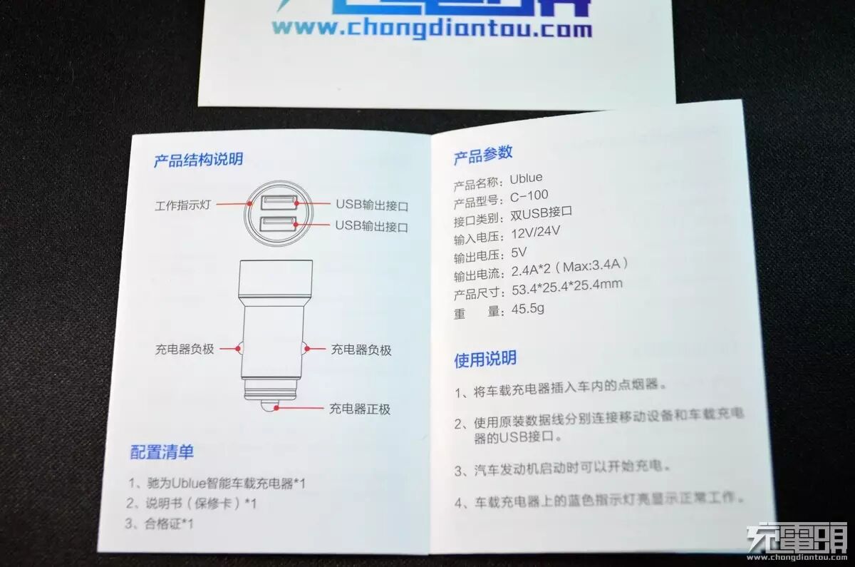 全家福,包括车充、中英双语说明书、合格证。