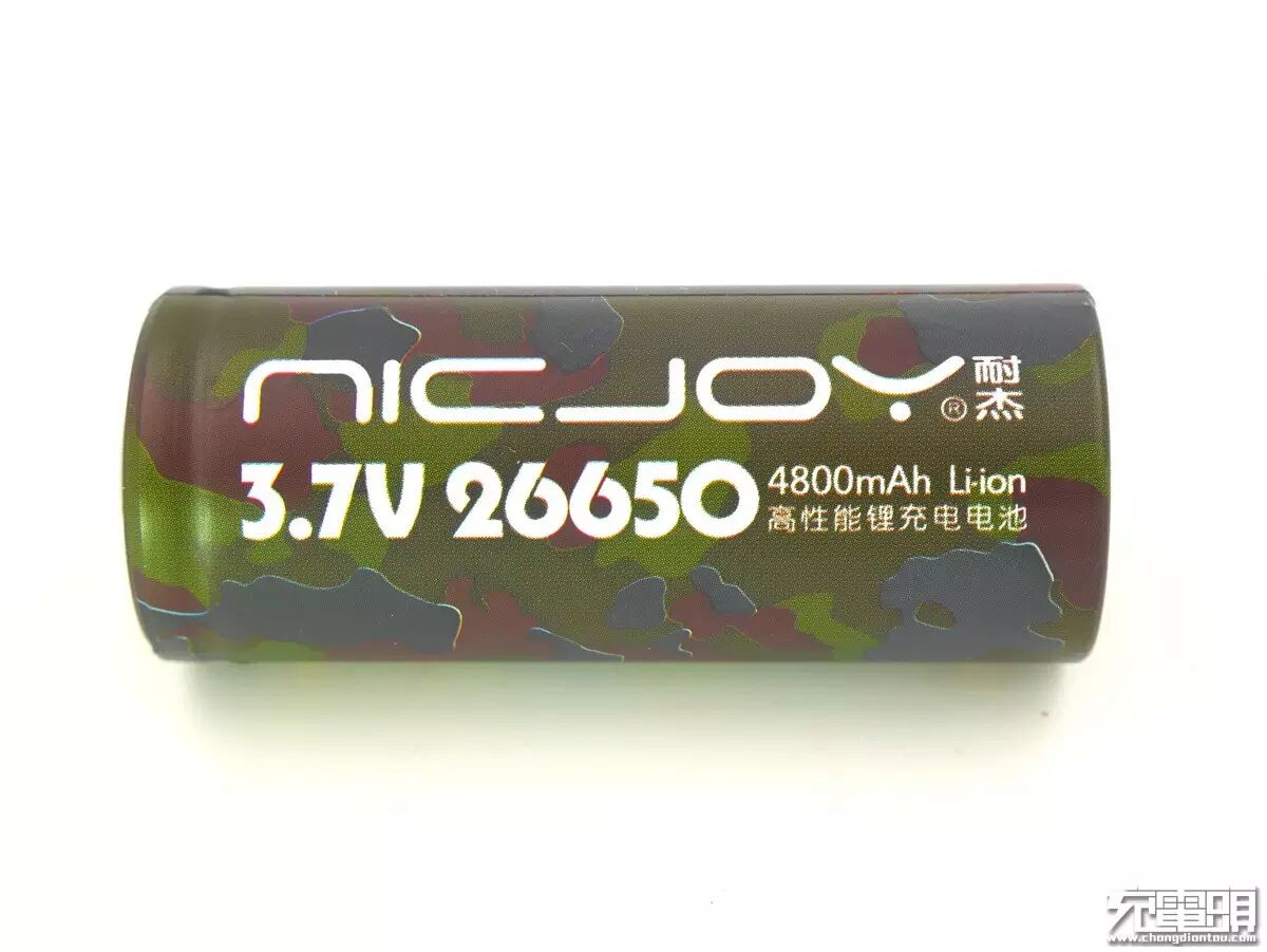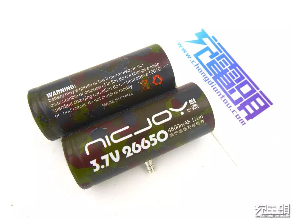 耐杰锂电池系列统一用迷彩外皮,外皮上印刷有耐杰电池的商标:NICJOY耐杰,并标注电池的尺寸规格、电压类型以及产品使用的警示(英文)。耐杰26650(4800mAh)锂电池。