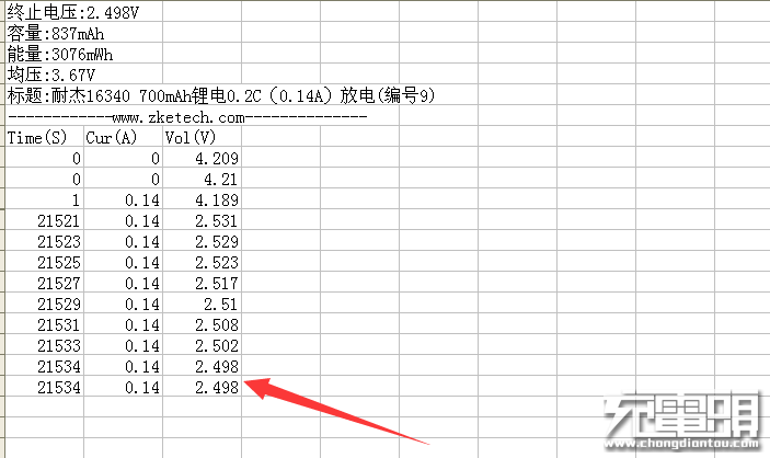 9、9号16340(700mAh)电池容量测试,0.2C放电:容量837mAh ,3.076Wh,均压3.67V,实测电池容量超出标称的700mAh 。有一个奇怪的现象,就是设定电池放电截止电压为2.50V,但仪器显示最终放到1V左右,经查阅仪器记录的数据,实际电池放电至2.498V截止,10号电池也一样,原因不明。